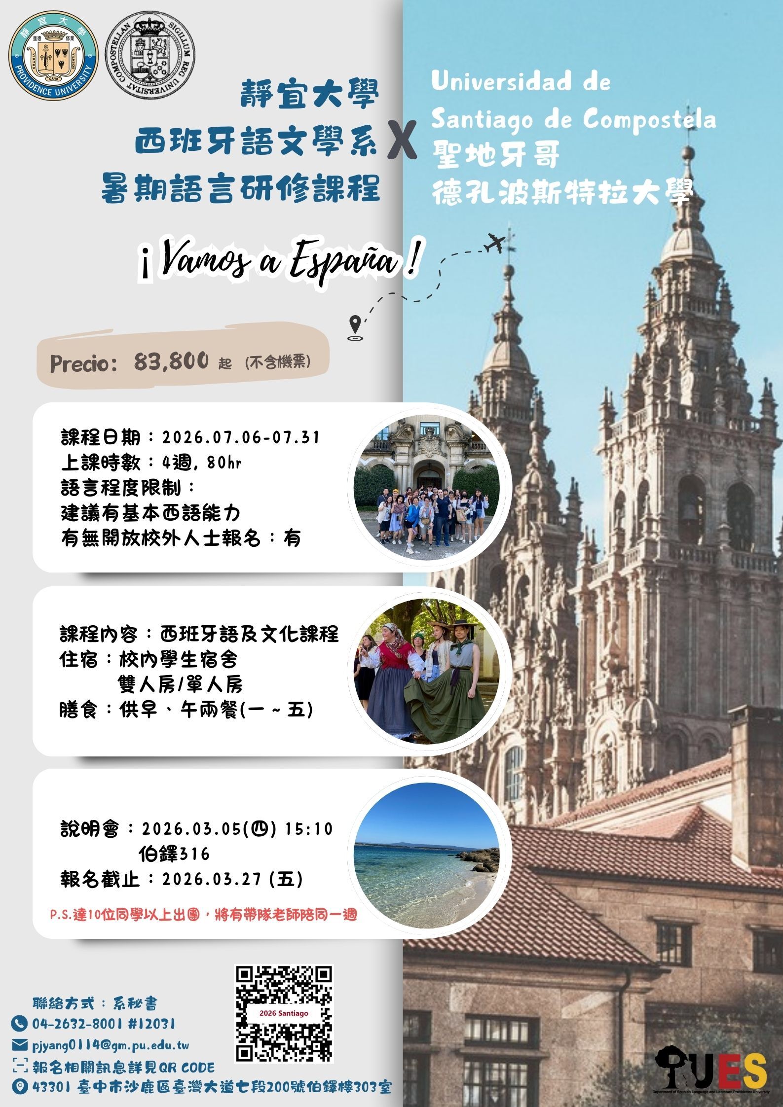 【暑期海外研修公告】2026西班牙Santiago暑期語言研修課程資訊